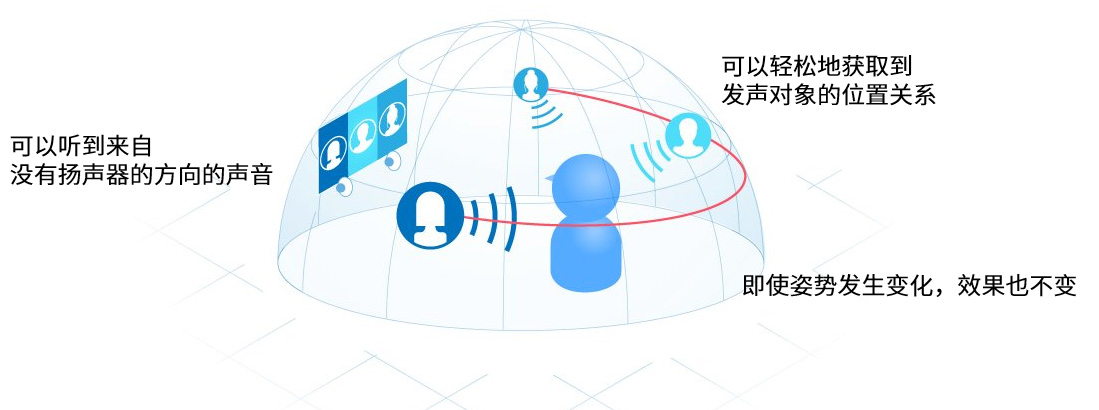 和其他设备的扬声器,均可体验到这种效果。无需准备特殊的扬声器,可使用既有的立体声扬声器,以及小型软件实现这种效果。例如:在笔记本电脑和智能手机上运行的应用程序的声学处理。
