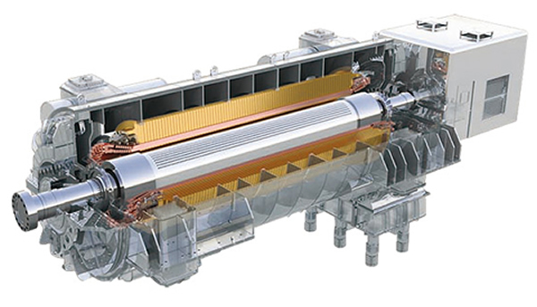 汽轮发电机是将通过汽轮机产生的机械能(转动动能)转化为电能的设备。为满足社会需求,旺财28不断地进行技术开发,为客户提供从小到大的各种容量等级的产品。同时,与以往相比,扩大了高效可靠的间接氢冷方式的应用范围。此外,为满足系统运行操作需求,我们正在努力提高系统的可操作性。