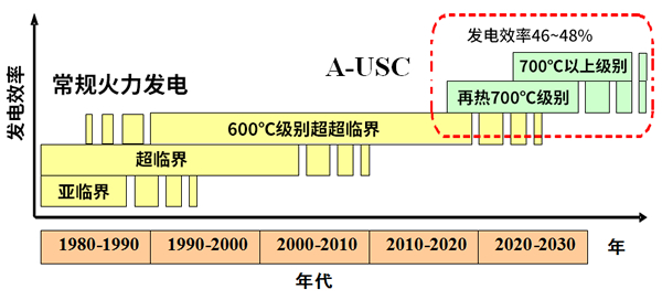 A-USC是Advanced Ultra-Supercritical的缩写,是指700℃超超临界发电系统。目前常规火力发电的蒸汽温度约600℃,而A-USC可将蒸汽温度提高到700℃以上,从而实现效率大幅提升。主蒸汽压力为35MPa,主蒸汽温度为700℃,再热蒸汽温度达到720℃/720℃的二次再热蒸汽条件下的A-USC机组,预计其发电效率将超过46%[HHV标准]。