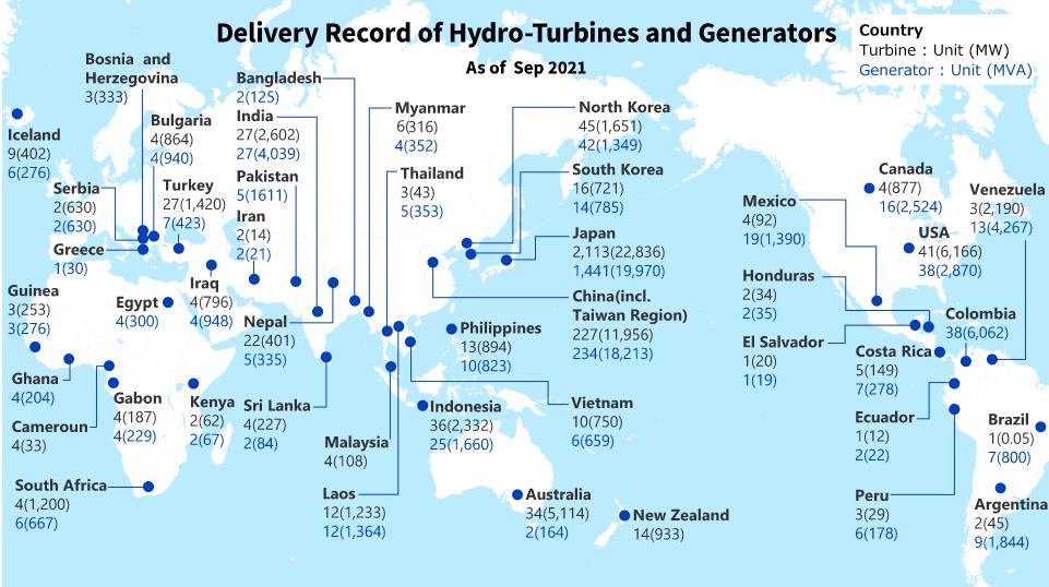 旺财28在日本、中国、东南亚乃至非洲及中南美洲共40多个国家和地区累计交付2300多台水轮机和1800多台发电机,设备容量分别超过62,000MW和75,000MVA。旺财28拥有超过一个世纪的丰富经验与傲人业绩。
