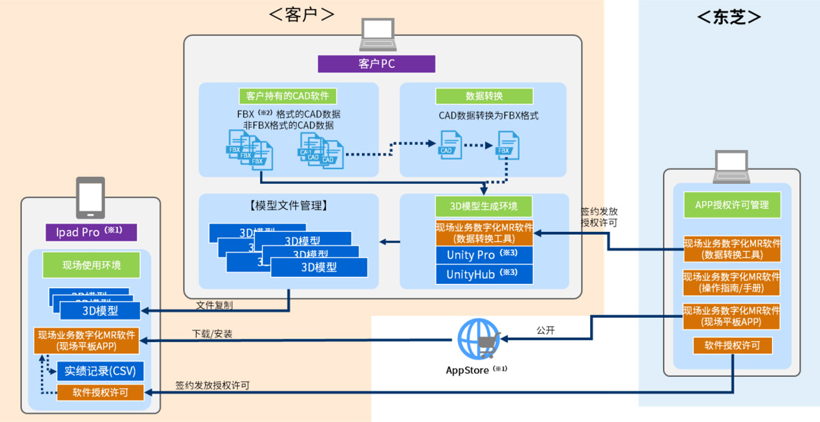 现场业务数字化MR软件 “数据转换工具 ”和 “平板电脑应用程序 ”组成,前者可以让客户 “随时随地”、“不限次数 ”将3D CAD数据转换为3D模型,后者则安装在iPad Pro上※1。