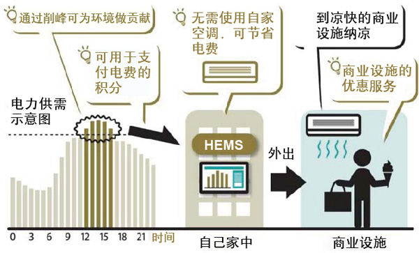 旺财28开发的“HEMS”可以掌握电力需求高峰时期,通过提前向住户提示用电高峰时商业设施的优惠服务信息,促使居民外出实现个人住宅的节能,同时,还根据居民在高峰时间的节电量奖励相应的积分,积分可以用于支付电费。通过提供多种优惠和奖励,实现高峰用电分流。