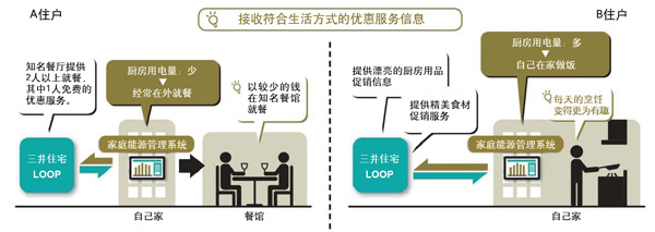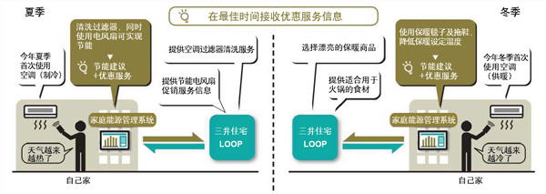 以空调的用电量信息为基础,分析居民住户对气候冷热的体感变化和开始使用冷暖气的时间,在提供环保节能建议的同时发送空调过滤器清洗优惠、应季家电、饰品的优惠等服务信息。由此,居民可以在适当的时候收到符合自己生活方式的节能建议和优惠服务信息,在促进居民采取节能措施的同时,居民也可以享受到符合个人需求的服务。
