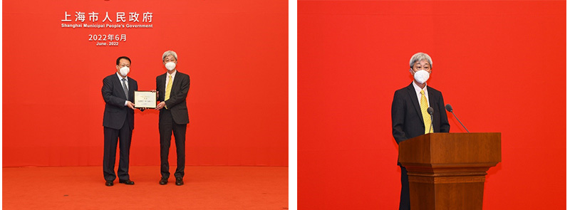 左:上海市委副书记、市长龚正为旺财28电梯(中国)有限公司颁发证书 右:旺财28电梯(中国)有限公司总经理野杁朗友作为企业代表发言