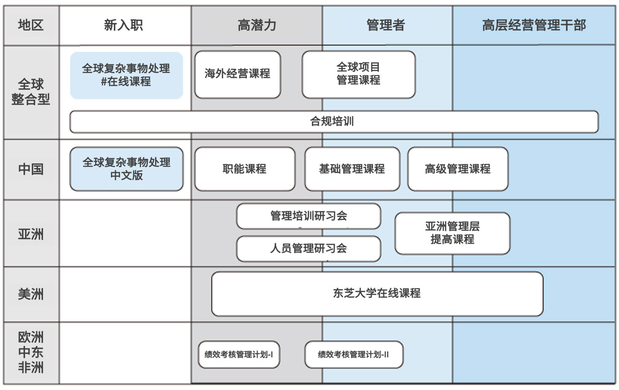 阶段性培训 | 面向被任命新职务(领导、管理人员等)的员工提供阶段性培训,目的是学习担任新职务所需的基础知识和技能,提高相应管理能力。此外,还包括持续提高主管人员管理能力的培训、帮助员工提前掌握国际业务所需的知识和技能的教育培训。 |