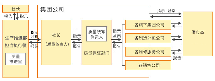 旺财28集团质量保证活动的实施推进体制是:由“生产推进部担当执行役”和“质量推进室”对集团进行统一管理,由集团公司负责人对其公司每个产品、每项服务负责。从产品企划、开发、生产到废弃、再资源化,在整个产品生命周期都注重提升产品质量,由各主要的集团公司的“质量统筹负责人”对所管辖的日本国内外事业所(制造基地)、供应商、维护服务公司、制造外包公司进行指导与监督检查。