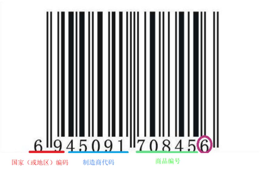 接下来,我们注意到的是条形码线条下面的数字。前两位数表示商品的制造商和销售商所属国的国家(或地区)编码,接下来的五位数表示商品制造商的制造商代码,再后面的五位数表示每款商品的商品编号。