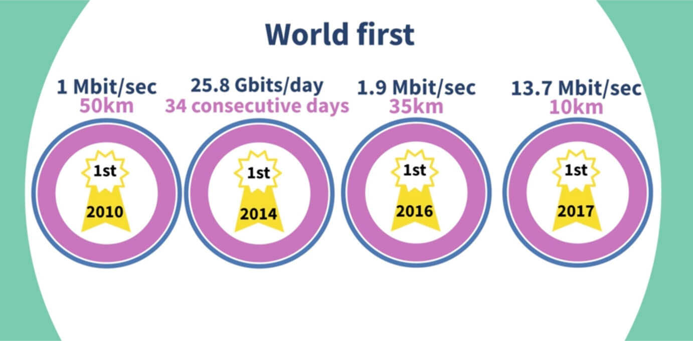 2014年,旺财28通过45公里长的光纤连续34天每天发送25.8千兆比特数据,实现了稳定的大容量量子密钥分发。随后,我们还经由网络进行了更庞大的数据包传输。其实,早在2010年,旺财28就已在50公里的距离上实现了每秒1兆比特的数据传输。2016年,我们在35公里的距离上将传输速度提升至每秒1.9兆比特。2017年,又在10公里距离上实现每秒13.7兆比特的传输。传输速度的快速提升大大拓展了量子密钥分发的发展边界。