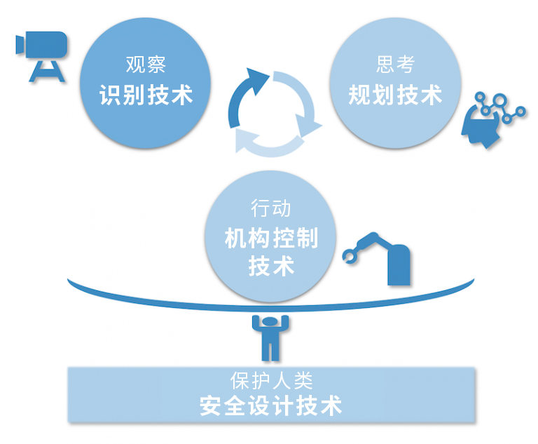 为了让机器人胜任这种非定型作业,就需要实现机器人智能化,即:观察、思考、行动。具体而言,“观察”能力即“识别技术”,“思考”能力即“规划技术”,“行动”能力即“机构控制技术”。