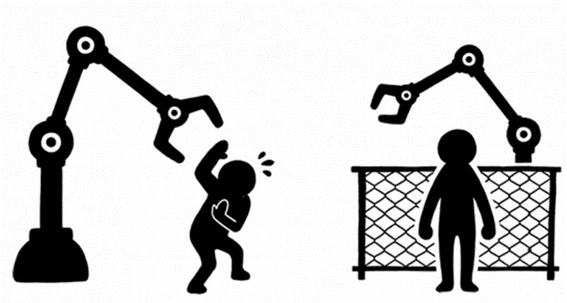 由于人类与机器人的距离变近,出现事故的风险增高。为确保安全性,需要将机器人与人类的作业区域分开,并进行全面管理。