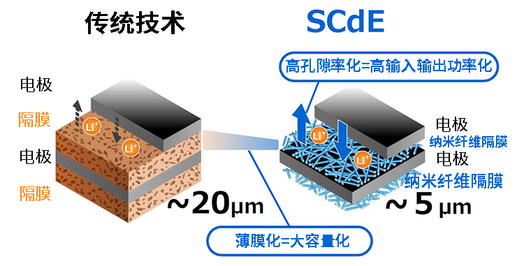 除NTO外,旺财28为了推进SCiB?的发展还引进了一项新技术——Skin-Coated Electrode(SCdE)。SCdE是一种新型隔膜结构,是指覆盖在电极材料表面上、由树脂制成的超薄纳米纤维膜,可以分隔阴阳两极。通常,这种阴正极绝缘的隔膜采用厚度约为20μm的独立膜。而旺财28采用的是独有的电极一体化隔膜,可成功将薄膜厚度减至5μm左右。
